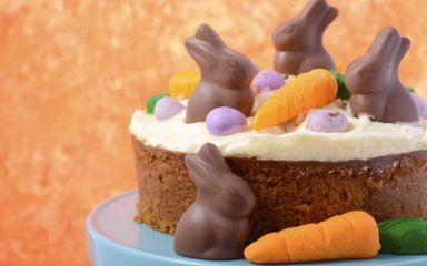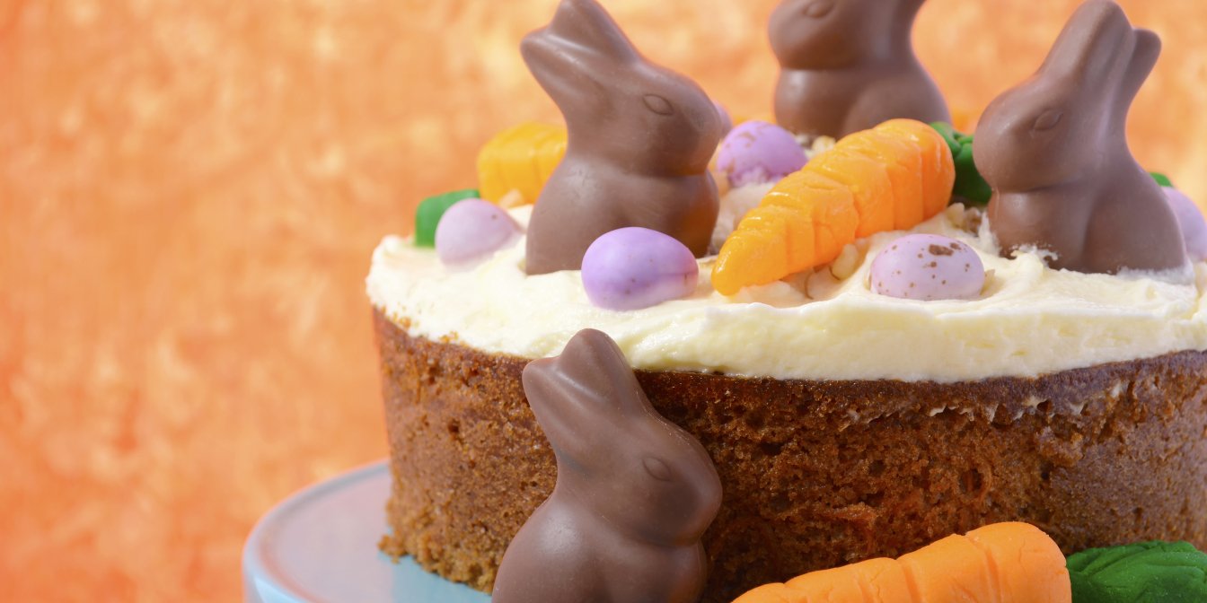 Якщо вам не подобається малювати, можна прикрасити верхівку торта шоколадними фігурками кроликів.