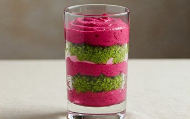Солений трайфл з буряка стане чудовою закускою у пісному меню або легкою веганською вечерею. Його можна подати порційно в прозорих келихах, щоб гості змогли оцінити гарні шари, або викласти в загальну форму для подачі. Готується він досить швидко, особливо якщо нут уже відварений, а буряк запечений заздалегідь.