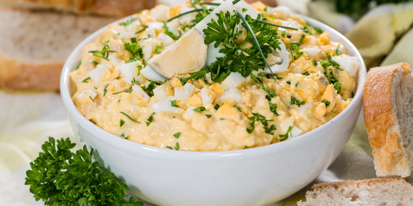 Традиційно яєчний салат заправляється майонезом. Однак це не обов’язково: можна взяти сметану, але гірчицю все ж додай для легкої пікантності. Якщо у тебе вже є зварені яйця та картопля, то салат приготується за лічені хвилини.