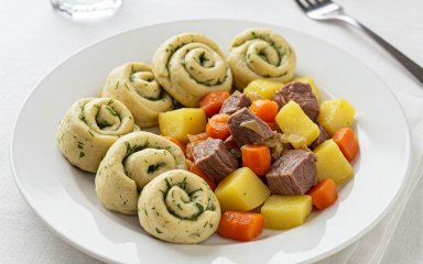 Головна особливість цієї страви — домашні нудлі. Вони роблять звичайну печеню з картоплі та м’яса цікавішими, додають текстури та чудово вбирають м’ясний бульйон. Готове тісто на кефірі легке в роботі, тому ти швидко впораєшся.