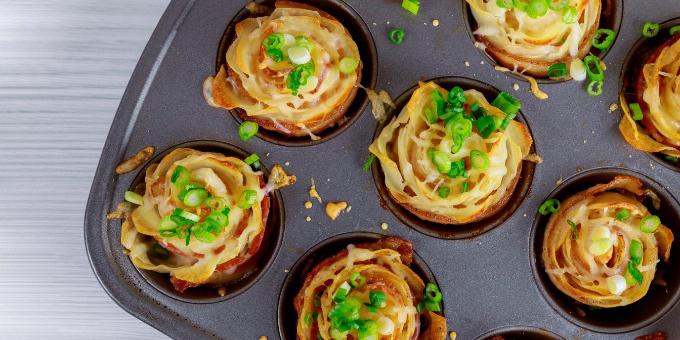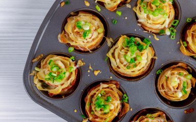 Приготування цієї хрумкої страви з картоплі не потребує складних інгредієнтів, лише коренеплід, інгредієнти для соусу та пармезан для гарної скоринки. А також форми для мафінів.