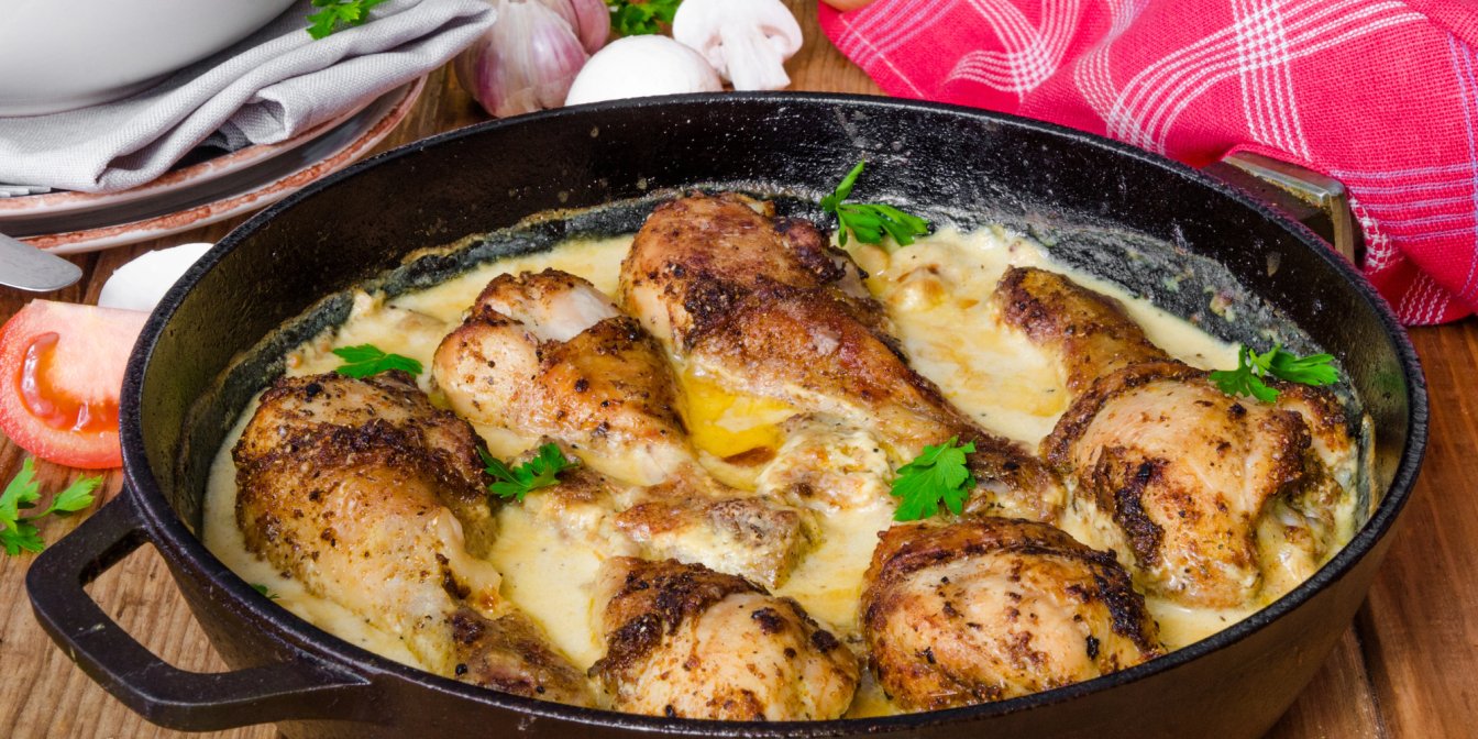 Вони мінімальні: курячі гомілки та сметана, яйця, зелень і помідори для заливки. Цей новий рецепт передбачає два етапи приготування. Щоб курка приготувалася швидко, зроби на кожній гомілці декілька надрізів.