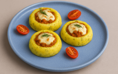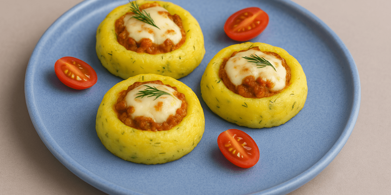 Зроби в кульках ложкою заглиблення та щедро виклади в них начинку. Зверху розклади нарізаний пластинками сир.