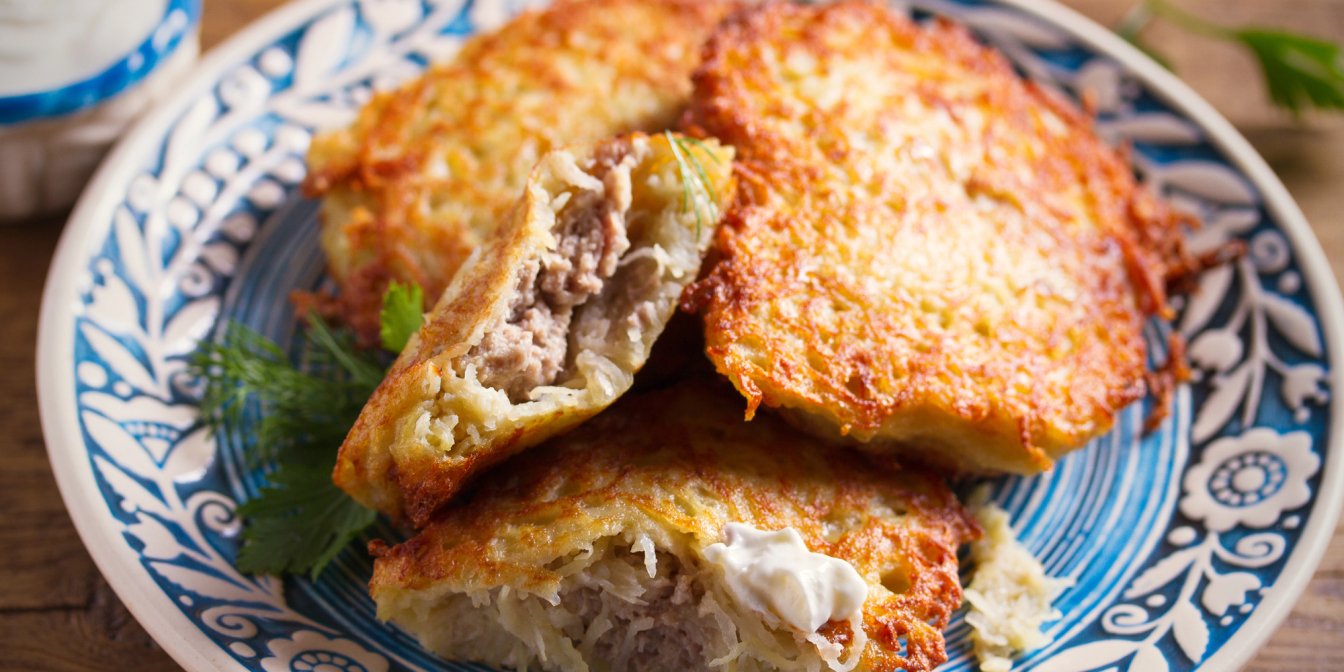 Цей рецепт картопляних оладок по-новому ми знайшли на Daily wrap. Їх презентують як традиційну для Литви страву. Секрет їхнього унікального смаку — ідеально ніжна начинка з м’ясного фаршу (курячого, свинячого, асорті — на твій смак) та хрумка картопляна скоринка.