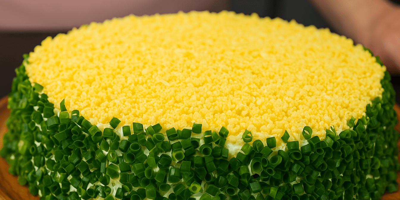 Зверху прикрась тертими жовтками. Розпуши жовтки виделкою. Краї торта змасти майонезом і посип зеленню.