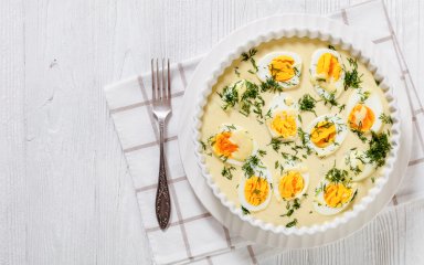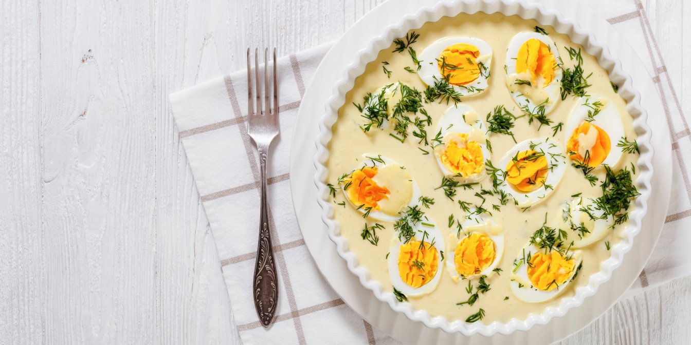 У європейських країнах яєчний салат і фаршировані яйця — популярні страви на Великдень. Спробуй приготувати популярну закуску, просто і швидко. Варені яйця подаються разом із соусом (в одній тарілці) з майонезу, натурального йогурту і гірчиці. Хрумкості страві додадуть мариновані печериці та огірки.