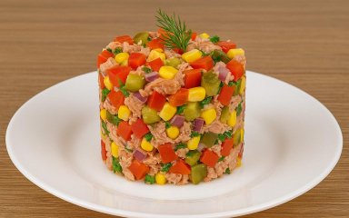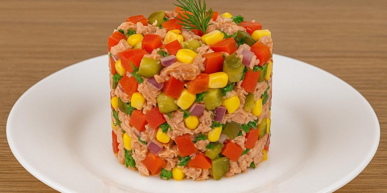 І закуска на святковий стіл, і повноцінний святковий салат — це про овочеву закуску «Обід рибалки» з консервованим тунцем. Вона буде хрумка і дуже симпатична. Нам знадобляться кукурудза, болгарський перець і маринований огірок. Заправляється така смакота олією.