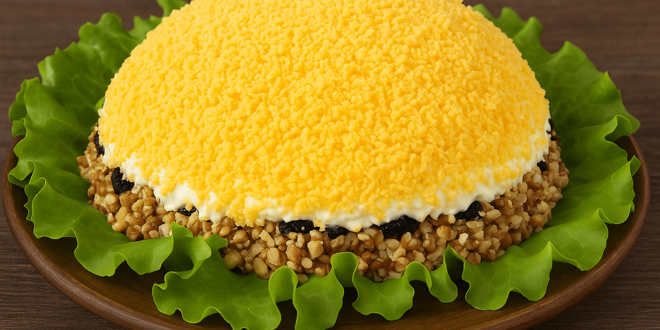 Це один із тих святкових салатів, які складаються з простих інгредієнтів і ефектні на столі! Крім яєць, плавлених сирків і волоських горіхів, до салату «Кульбаба» додамо чорнослив, трохи часнику та зеленої цибулі.