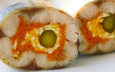 Подібні страви, тобто рибні рулети, дуже очікувані гості на святковому столі. Готувати їх просто, хіба що потрібен час, щоб вирізати хребет і прибрати кістки. У цьому плані скумбрія слухняна рибка, декілька надрізів навколо хребта — і він легко витягується.