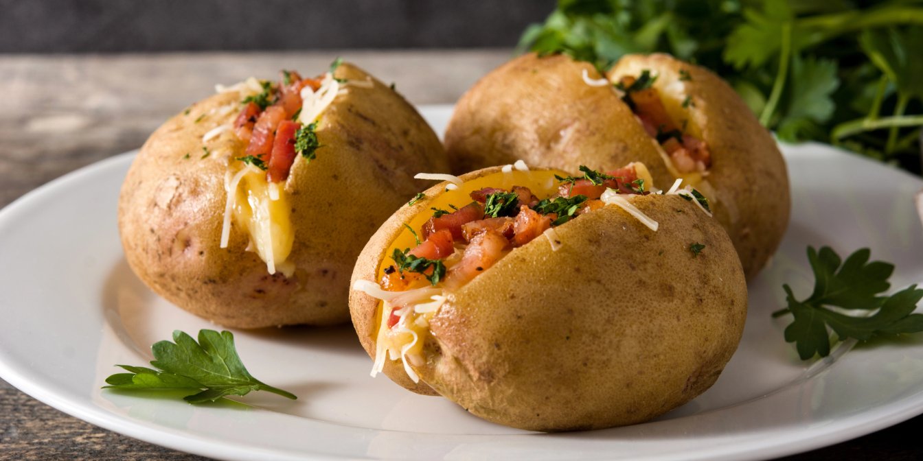 Велику картоплю добре помий, загорни у фольгу і запікай на розжареному вугіллі 30-40 хвилин до м’якості.