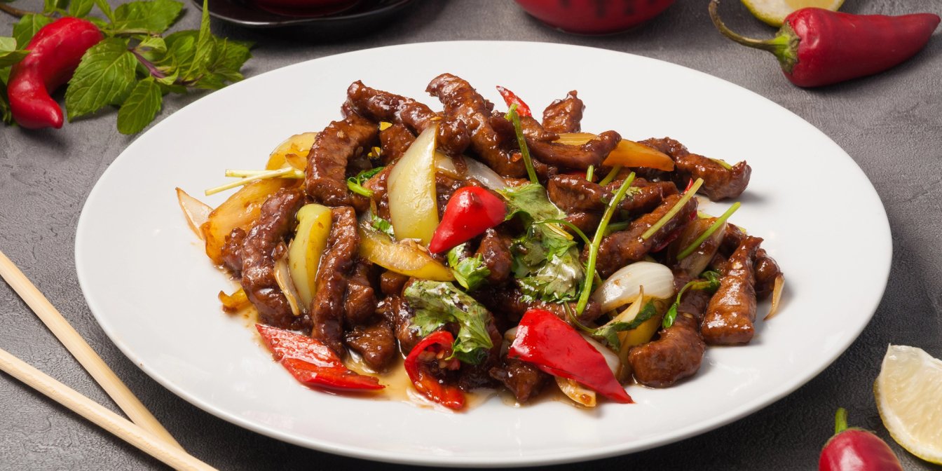 Основу цієї вечері в азійському стилі складають тонко нарізана яловичина, болгарський перець, морква, цибуля та рисова локшина, яка вбирає в себе весь соус. Подається м’ясо з овочами по-корейськи гарячим, відразу зі сковороди — без тривалих маринадів і складної підготовки.