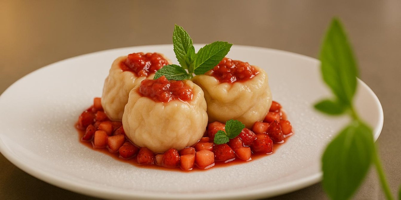 Полуниця в цих солодких варениках дає соковитість і легку кислинку, особливо якщо додати трохи цукру і м’яти. А подача — взагалі суцільне задоволення: зверху на вареники викладається м’ятний тартар. Ідеально як весняно-літній сніданок або десерт, коли хочеться здивувати близьких «лінивими варениками», але в новому форматі.