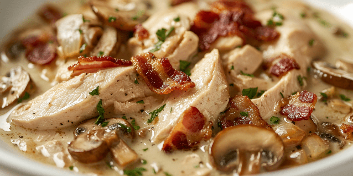 М’ясо дістань зі сковороди й відстав кудись у тепле місце — воно скоро знову знадобиться. Тим часом у той же жир на сковороді всип подрібнені гриби, цибулю та бекон. Обсмажуй їх, періодично помішуючи, поки вони не стануть м’якими. Далі всип до них трохи борошна, ще раз перемішай і влий курячий бульйон.