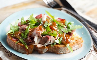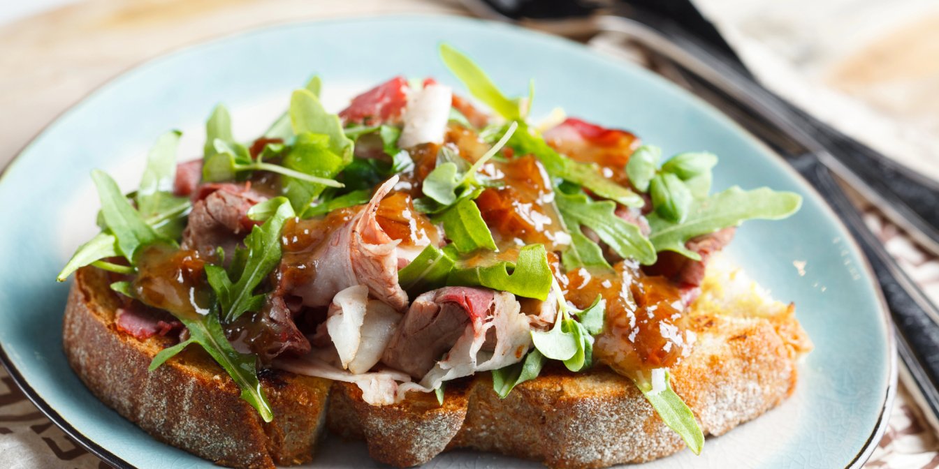 Щоб приготувати брускету з яловичиною, потрібне якісне і свіже м’ясо, нарізане на тонке філе. Хліб, а саме французький багет, — обов’язково підрум’янений, бажано з оливковою олією. А зверху — начинка з карамелізованої цибулі, маринованих грибів, руколи, зернової гірчиці та сиру. Це той випадок, коли складники прості, а результат — ресторанний.