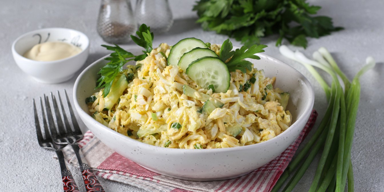 Цей ситний салат цілком може стати фаворитом для тих, хто дотримується збалансованого харчування. Заправка — сметана з кількома зубчиками часнику. Якщо не любиш часник, заміни його на дрібно нарізану зелену цибулю.