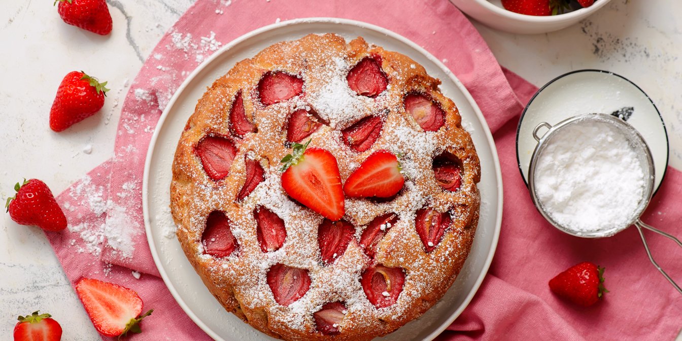 І так, це буде лінивий рецепт сезонної випічки з полуницею. Тісто замішується за 25 хвилин, плюс 5 хвилин, щоб розкласти нарізані ягоди зверху.