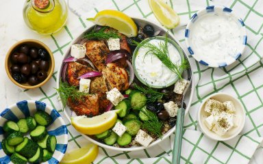 Розклади порційно кіноа по тарілках. Додай курку, овочі, оливки й фету. Соус подавай окремо або полий зверху перед подачею.