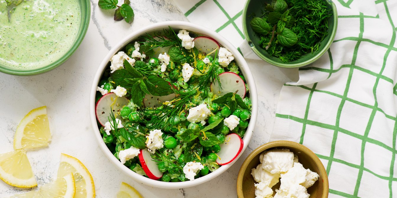 Густа заправка з горошку, грецького йогурту та лимонної цедри чудово доповнить овочі, свіжу духмяну зелень та ніжну фету.