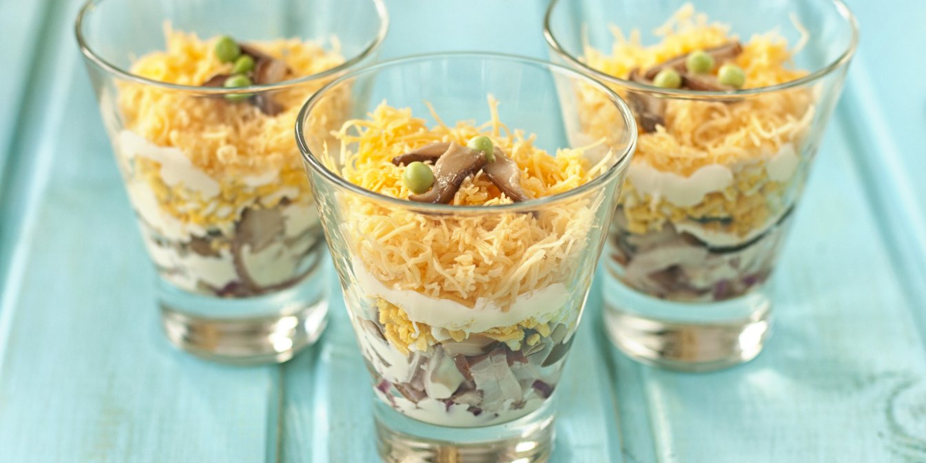 Для салату на день народження або на інше свято ефектно збирати «Улюбленець застілля» в креманках. Перемішувати чи викладати його шарами — твій вибір. Контролюй кількість солі в салаті, бо м’ясо і сир уже солоні.