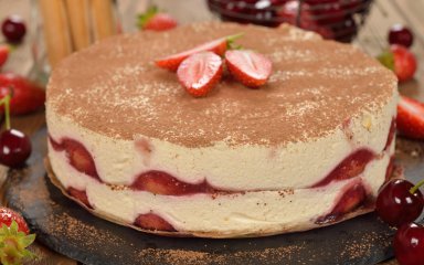 Тирамісу з полуницею — сезонний варіант класичного тирамісу. Особливістю цього десерту за рецептом фудблогерки Вікторії Попін є не лише наявність ягоди, а й те, що він готується на основі йогурту. Такий полуничне тирамісу має характерну ніжну текстуру і вишуканий літній смак.