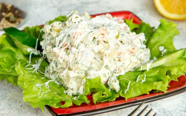 Що може бути краще, ніж салат з куркою, мисливськими ковбасками й маринованими огірками під сиром і ніжною заправкою з майонезу?