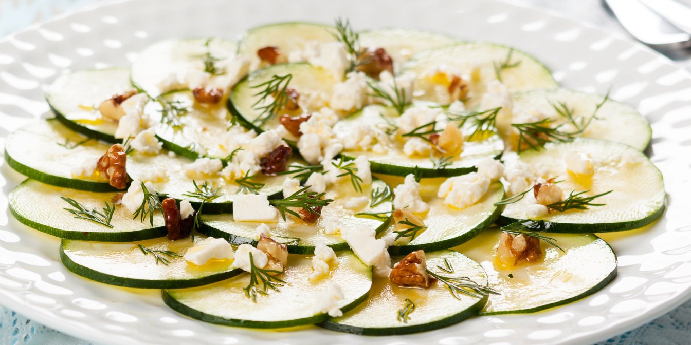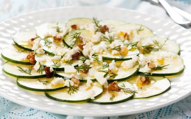 Цей літній салат складається з маринованих кабачкових слайсів, кремової фети (бажано брати козячу), фініків і волоських горіхів. Для заправки використовуємо діжонську гірчицю, лимонний сік, мед та оливкову олію.