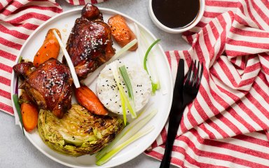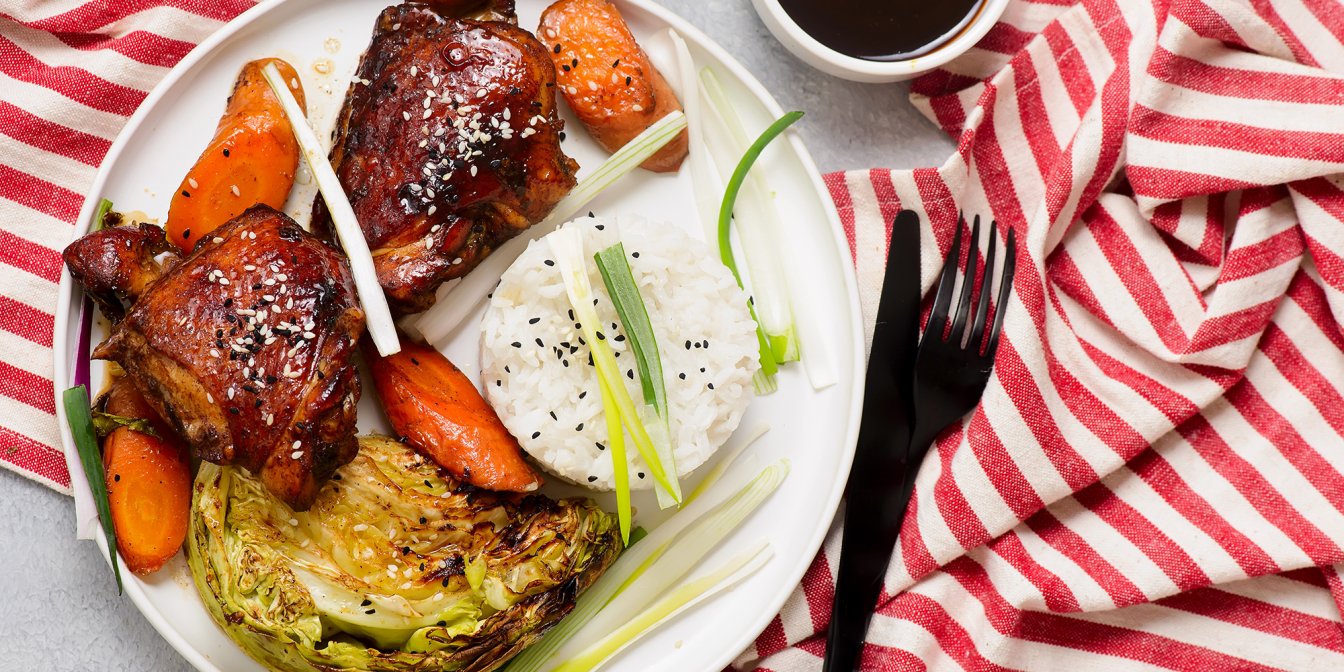 Соковита курочка на вечерю — саме те, що потрібно. А соус теріякі додасть до її смаку солодко-солоних ноток. Важливе доповнення до м’яса — морква та молода капуста. Запікаючись, курка насичує своїми соками овочі, завдяки якому створюється вдалий смаковий ансамбль.
