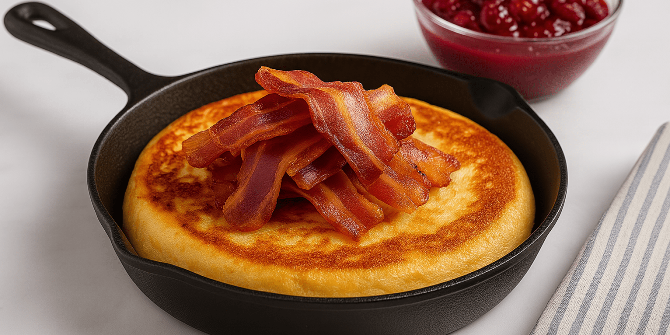 Влий у сковороду тісто, розклади зверху бекон, вогонь зменшуй до середнього та готуй 10–12 хв у духовці або на плиті під кришкою, не перемішуючи. Потім збільшуй температуру й допікай ще 3–5 хв до золотистості по краях.