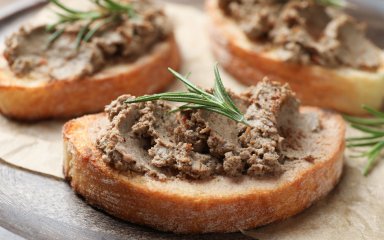 Подавай намазку на грінках, змащених часником, з салатними листками і овочами.