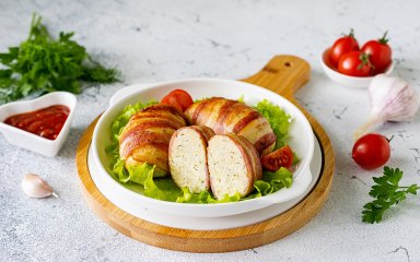 Готову страву з курки з беконом подавай з улюбленим гарніром, соусом та салатом зі свіжих овочів.