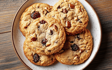 Хрумкі волоські горіхи та вишні зі своєю кислинкою створюють класне поєднання смаків і текстур. Це зручний рецепт, бо можна використовувати вишні з варення, як для печива «Ромашка», або свіжі ягоди без кісточки. Їх розкладемо на гарячому печиві.