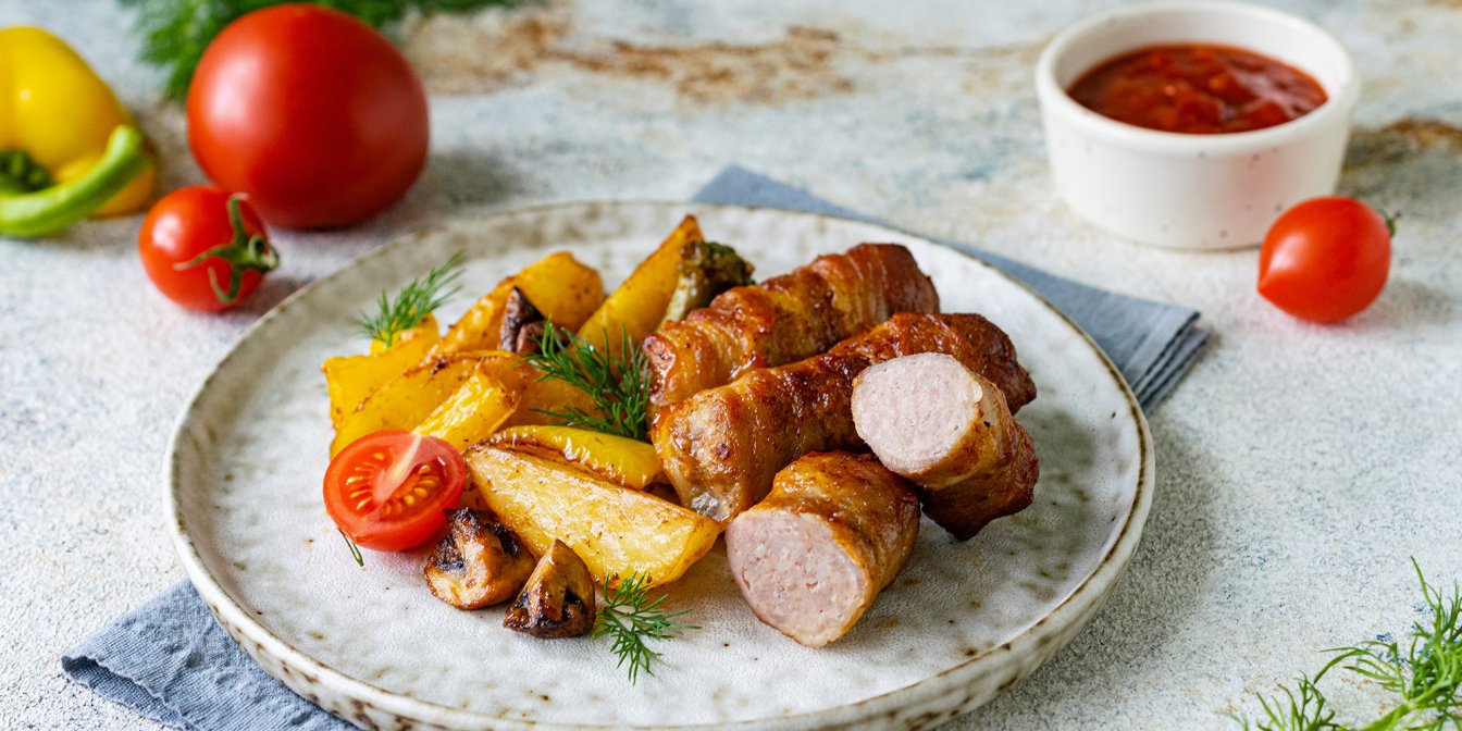 Поверх овочів з грибами виклади на невеликій відстані одна від одної м’ясні ковбаски в беконі.