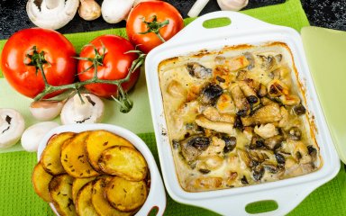 На картоплю виклади весь плавлений сир. Зверху розподіли обсмажені гриби з цибулею.