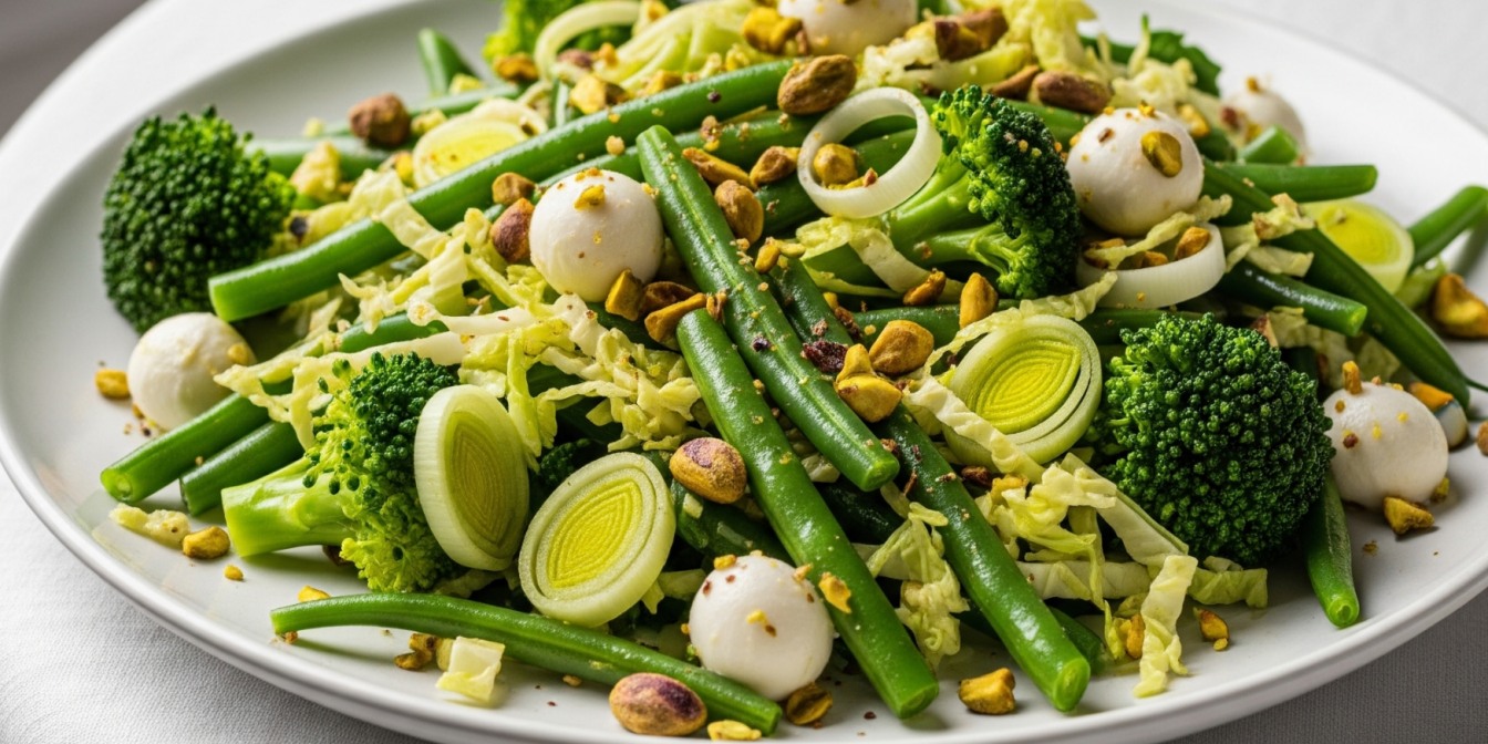 Якщо шукаєш ситну овочеву страву без м’яса, теплий салат з овочами та моцарелою в духовці — це вдалий варіант. Броколі дає текстуру, стручкова квасоля — колір, капуста — соковитість, порей — легку гостроту.