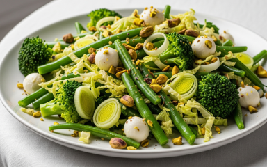 Капусту помий, прибери серцевину й наріж широкими смужками. Броколі розбери на суцвіття. Цибулю порей наріж кільцями. Фісташки подрібни.