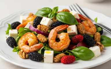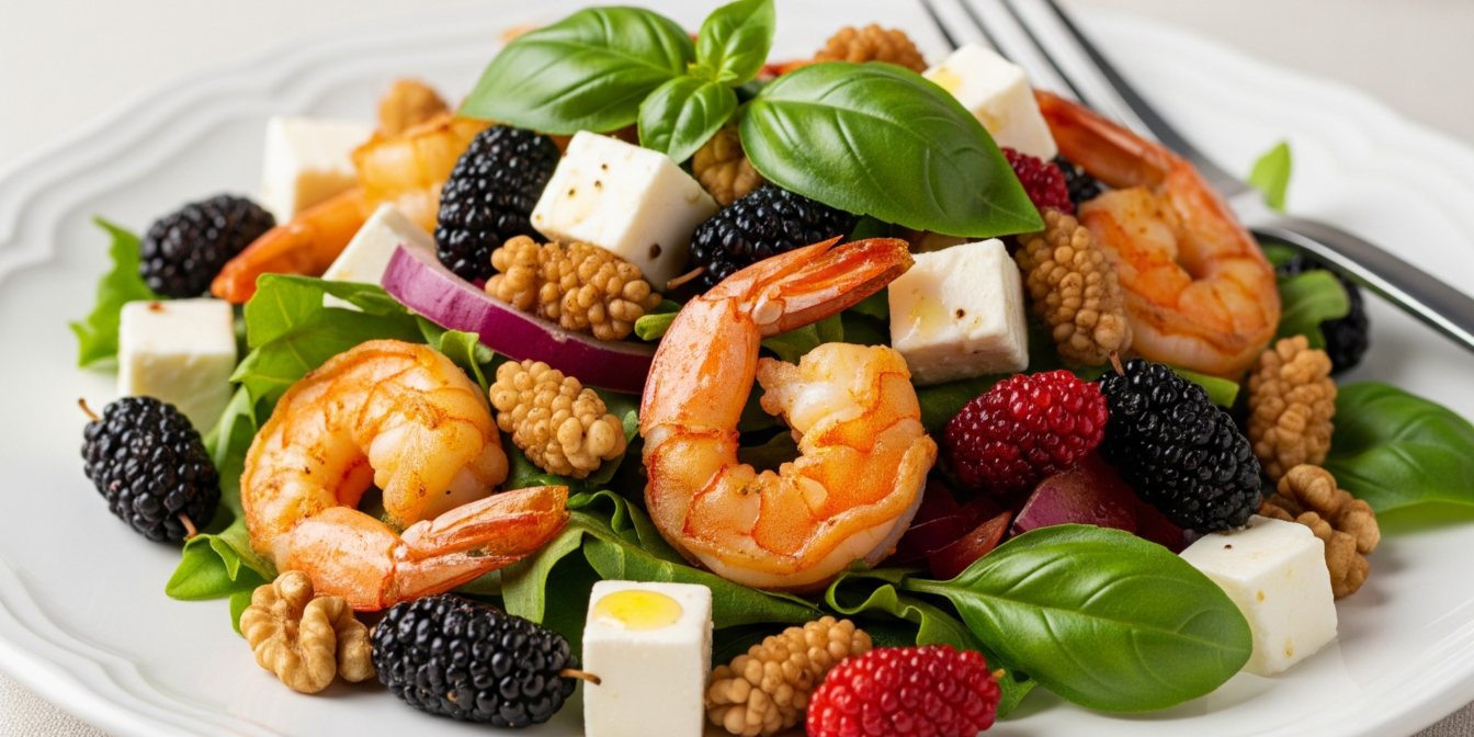 Чому варто спробувати салат з шовковицею? Контраст солодкої ягоди та солоної фети — класика, яку підсилює пряний базилік. Креветки з часником додають насиченості, перетворюючи салат на ситну страву. А медовий соус з лимоном освіжає та підкреслює смак кожного компонента.