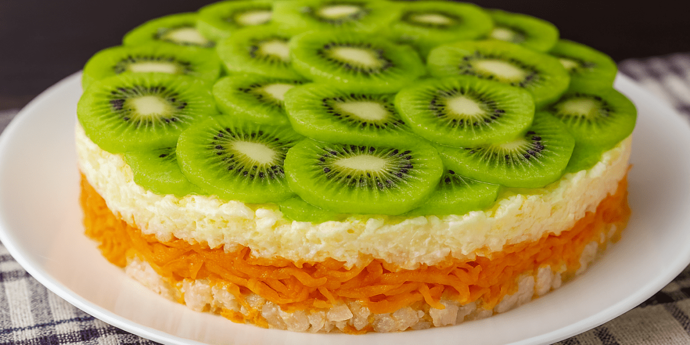 Салат з куркою, морквою по-корейськи та ківі збирається шарами. Це той рецепт салату, який поєднує в собі солоні та солодкі з кислинкою смаки. Звісно, кількість ківі можна міняти, але фрукти мають повністю покрити салат зверху. Зберігай апетитний рецепт!