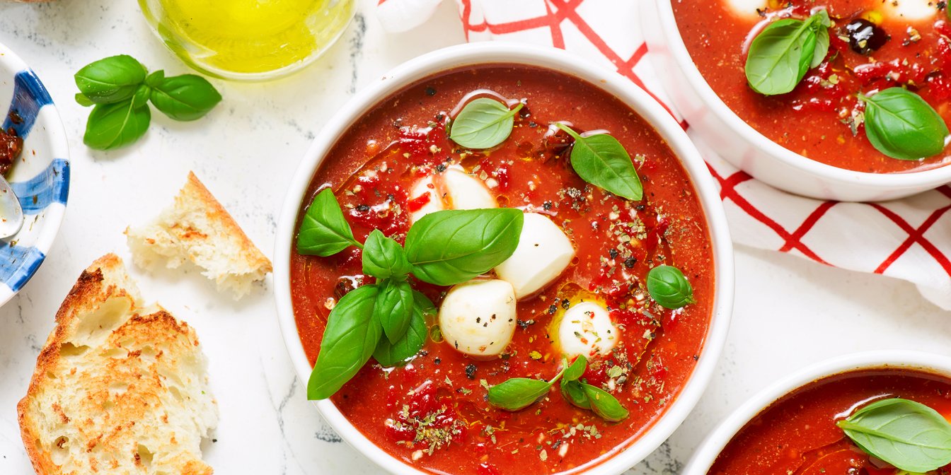 Суп подаємо з моцарелою та підсмаженою чіабатою. Тож густий томатний суп чудово доповнюється ніжністю моцарели та хрусткими скибками чіабати. Прикрашений духмяним базиліком, наш суп стане прекрасним літнім обідом — запашним, смачним, поживним і при цьому легким!