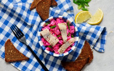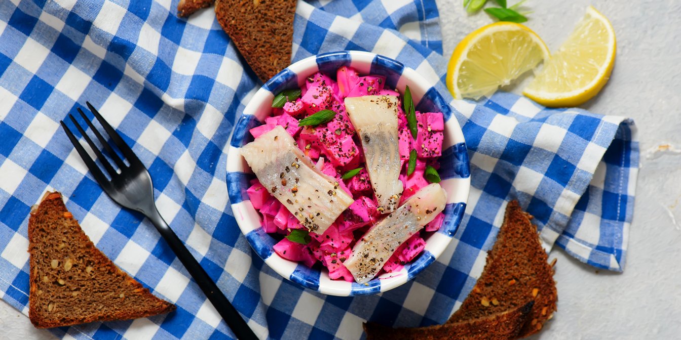 Цей салат з матіасом і буряком — справжня шведська класика. Його готують удома так само часто, як ми готуємо вінегрет. В сезон матіаса, молодого оселедця, який іще не нерестився, в салат додають цю рибку, а в інші пори року — звичайний малосольний оселедець.