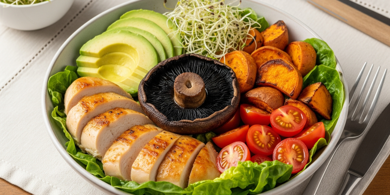 Боул з курячим філе, авокадо та грибами — це збалансована страва, що складається з окремо приготованих інгредієнтів, які викладають у миску порційно. Такий підхід дозволяє поєднати різні текстури: хрумкий салат, м’який батат, соковите куряче філе й кремове авокадо. Цей боул з куркою та грибами може бути частиною раціону без глютену, адже не містить зернових.