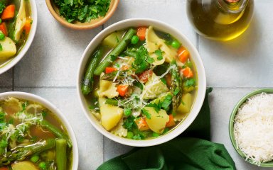 В розпал сезону молодих овочів так хочеться готувати їх в різних варіаціях! Тож спробуй легкий суп мінестроне з горошком. Корисний, поживний мінестроне з додаванням пасти — чудовий обід в розпал літа.