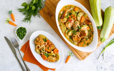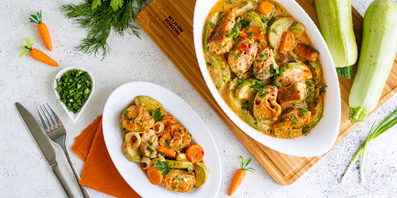 Пропонуємо ситну й ароматну вечерю — дієтичного хека, запеченого з кабачком та іншими овочами у сметанно-томатному соусі. Сік лимона надасть страві пікантної цитрусової нотки, а копчена паприка наситить страву ароматом димку.