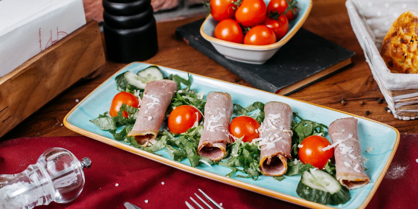 Шинку наріжте тоненькими слайсами, розкладіть начинку на середину кожного шматочка і згорніть у рулети.