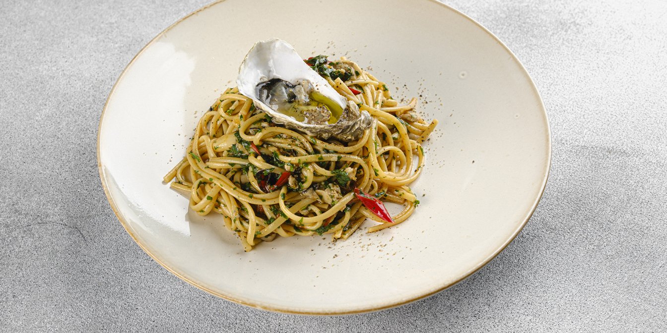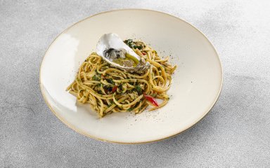 Виклади пасту на тарілку та прикрась устрицею, яка лишилась в панцирі. Зверху додай петрушку, трохи оливкової олії та перець чилі за потреби.