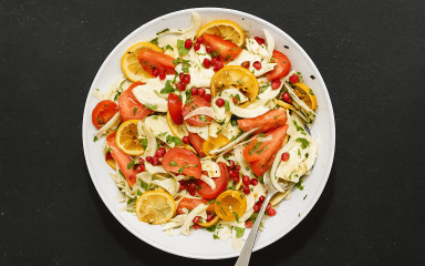 Салат із фенхелем, запеченим лимоном і томатами — це середземноморський варіант овочевої страви, де лимон запікається для пом’якшення смаку, а фенхель надає легкої анісової ноти. Свіжа зелень і гранат підсилюють смаковий баланс свіжого вітамінного салату.