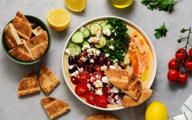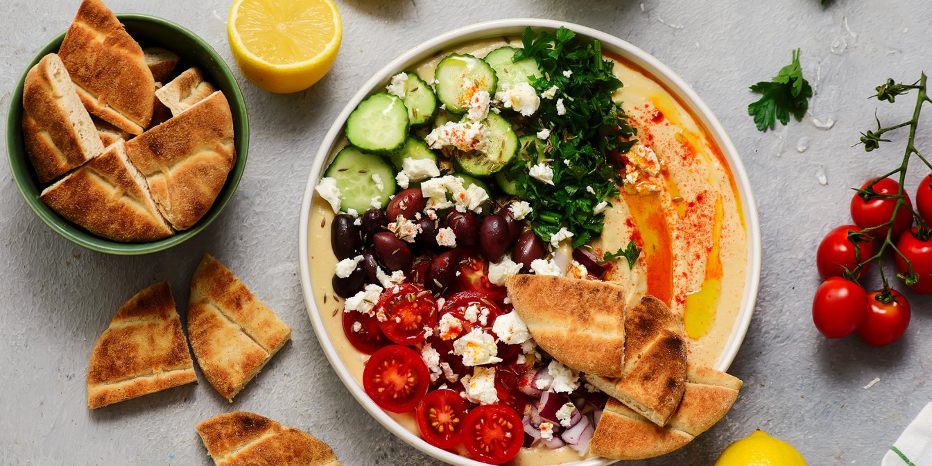 Виклади в глибоку тарілку хумус, збризни оливковою олією та присип паприкою. Додай овочі, зелень, оливки й посип крихтами фети. Подавай із пітою чи лавашем.