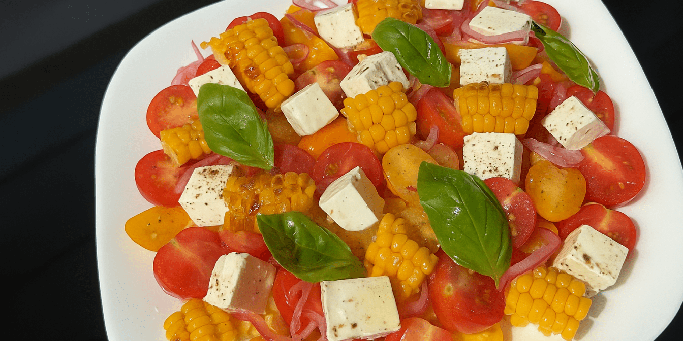 Літній салат із кукурудзою від блогерки mariiam_foodblog — це поєднання свіжих овочів, солодкої кукурудзи та фети, що створює гармонійний баланс смаку та текстури. Кукурудза для цього овочевого салату грилюється з вершковим маслом та спеціями, що підкреслює її аромат.