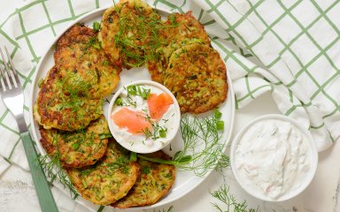 Кабачкові оладки з йогуртовим соусом — це страва, у якій ніжна текстура кабачків поєднується зі свіжою зеленню та кислинкою грецького йогурту. Соус з копченим лососем робить їх більш поживними та вишуканими.