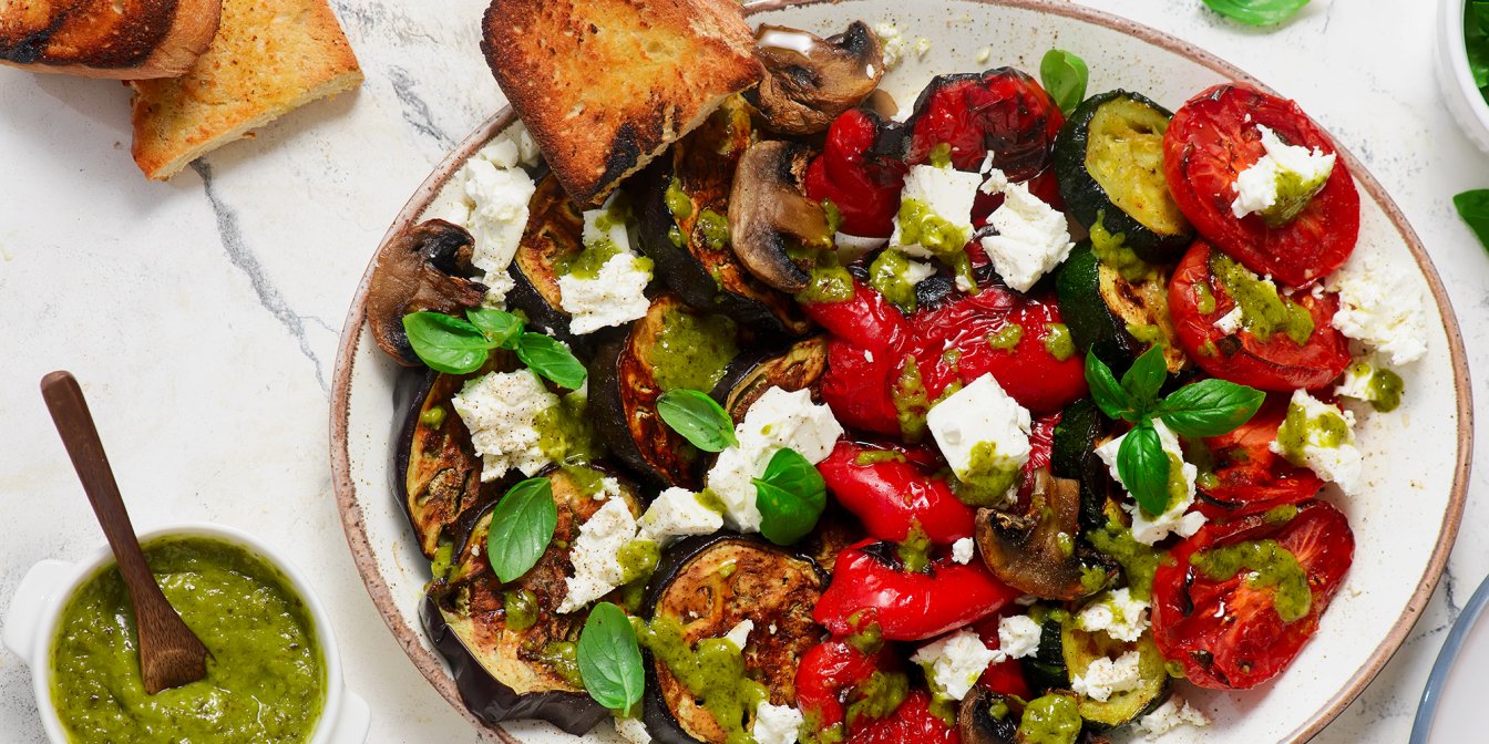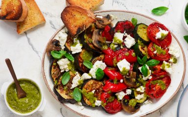 Салат із запечених овочів з фетою — це страва, де поєднуються баклажан, цукіні, болгарський перець, томати та гриби. Завдяки запіканню овочі отримують насичений смак, а фета та соус песто створюють баланс солоності й свіжості.