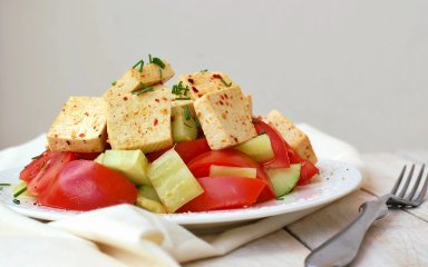 Салат з огірком, тофу й лимонною глазурʼю — це легкий салат, у якому поєднуються свіжість овочів і хрусткість тофу. Завдяки пряній лимонній заправці страва має яскравий кисло-солодкий смак і добре освіжає в теплу пору року. Такий салат можна подавати як основну страву або ж як гарнір до неї.